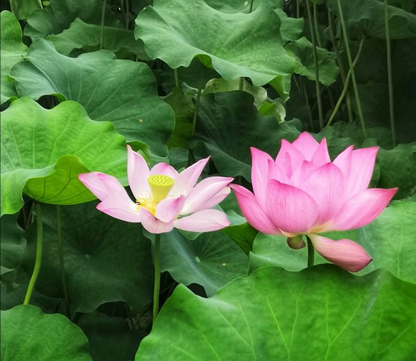 來到荷塘邊扶欄而望,滿眼的碧綠荷葉層層疊疊,猶如一把把圓傘撐開在水面上,荷葉上晶瑩的水珠,仿佛是落在綠色盤子里的珍珠,盡顯它獨特的靈氣。再看看那被一根根綠色梗子撐著的荷花,高高立在水面上,有的綠中帶紅,含苞待放;有的只開兩三片花瓣,略顯嬌羞;而那全開的荷花,露出嫩黃色的花蕊和小蓮蓬傲然地向我們展示著它們最美的面容,讓人賞心悅目,陶醉其中!微風吹來,那碧綠舒開、裊裊婷婷的荷葉,亭亭玉立、纖塵不染的荷花,隨風搖曳,婀娜多姿,寧靜而柔美,高潔而清雅,充滿詩情畫意……